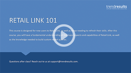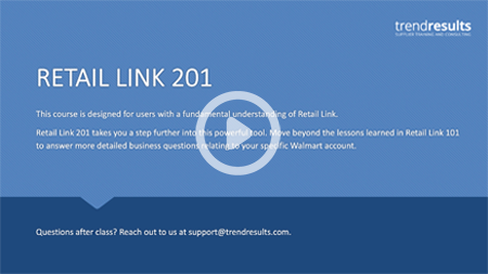 Choose from one topic, or the entire suite of video content. The videos are yours to view as many times as you need, and all come with comprehensive documentation.The objective of this course is to provide Walmart US suppliers with a broad overview of the most common features and applications of Retail Link, including basic report building.
